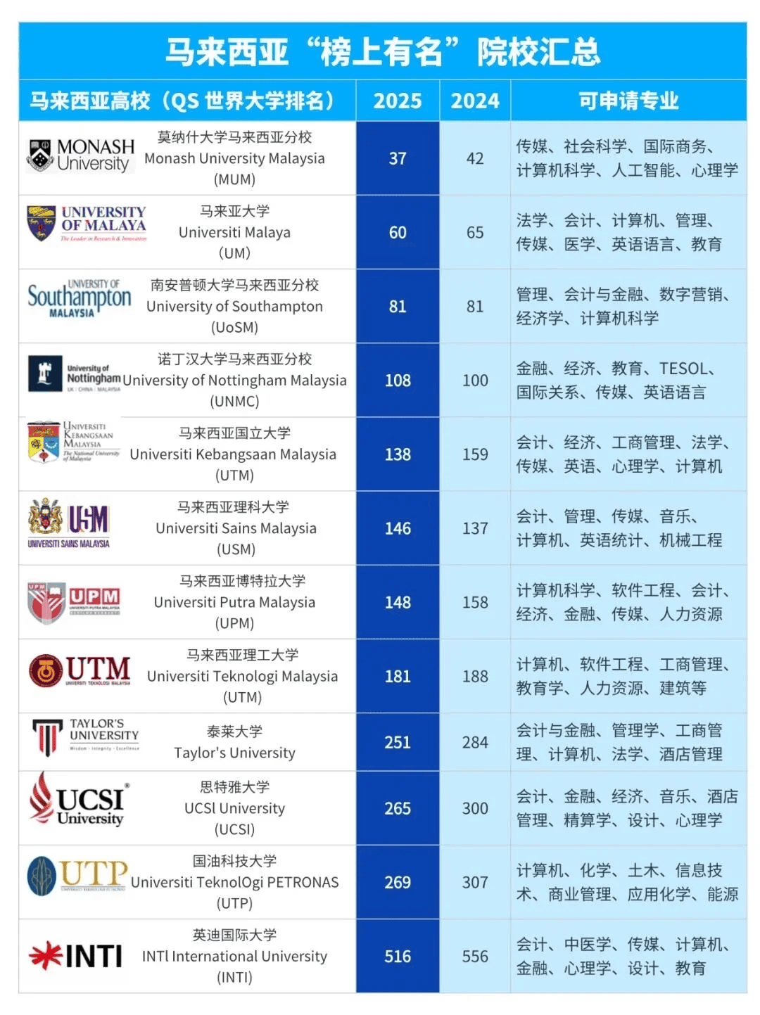 马来亚大学Universityof Malaya1905q徏校,公立研究型分析大学,位于马来西亚首都吉隆坡。环承^z大盟,亚洲大盟Q东盟大盟,全球产学来人才培育{略联盟Q以文理学科和医学著U正在很多学U范畴n有世界的声誉,多个学科范畴q入世界?00名,此中17个学U范畴进入世界前100名。正?025q高教育研I机构QS发布排名中,马来亚大学位列全球第60位。马来西亚国立大学TheNationalUniversity of Malaysia1970q徏校,马来西亚五所公立研究型大学之一Q?011q_学校正式核准中文名字为马来西亚国立大学;东盟大盟Q英联邦大学协会Q亚z取承^z大学协会;共有13个学院是一所分析型大学,专业普遍Q有文、理、工、商、医U等各类专业Q被泰晤士报教育专刊列ؓ世界U技cd?00强。正?025q高档教育研I机构QS发布排名中,马来西亚国立大学位列全球W?38位。马来西亚理U大学UniversityofScience Malaysia1969q徏校,公立研究型分析大学;素有“亚洲的花圃大学的佌Q具有三个校区,?8个学院及26个研I核心,500多个专业范畴的硕士和博士学位评Q东盟大盟。马来西亚教育部选中成ؓAPEX(q向杰出打算)大学Q经学、艺术学、理学、工学医学ؓ马来西亚国度沉点学科。正?025q高教育研I机构QS发布排名中,马来西亚理科大学位列全球W?46位。马来西亚博Ҏ(gu)大学Universiti Putra Malaysia1931q徏校,东南亚出名分析性研I型大学Q?1%的教师具有博士学位;d学、农业和林业专业位居马来西亚W一Q经取办理学院和商学院同时荣获AACSB商学院认证,是马来西亚第一个世界l管院取商学院;文学、英语、科学、教肌Ӏ计较机U学取消息、会计取金融、工商办理、经学取计量经学、电(sh)子工E、机械工E和化学工程范畴Q位居世界学术排行榜200强;2025q高档教育研I机构QS发布排名中,马来西亚博特拉大学位列全球第148位。马来西亚理工大学University of Technology Malaysia1984q徏校,公立研究型大学,从校Z于柔?jng)州新山市,分校正在吉隆坡市核?研究生院)Q有12个学院和20多个研究所和核心;学校全英讲课Q利于英语能力的提高Q同时学生可选择专业面广Q以办理和手艺类专业见长Q专业劣势出众,׃前景好?025q高教育研I机构QS发布排名中,马来西亚理工大学位列全球W?81位。伍伦A(ch)大学马来西亚校区University of Wollongong Malaysia始徏?951q_正在全球有四个分校!本部、_拜分校、马来西亚分校以及分校。从校区位于新南威尔士州伍u贡市Q是大学全球合做联盟、亚太地域大盟、也是颠末AACSB商学院N易认证的高档学府。该校其消息手艺、计较机U学、工E学范畴代表全澳尖E度Q计较机学院是最大的ICTU研核心Q南半球最大的消息手艺取电(sh)信研I机构之一?025q高教育研I机构QS发布排名中,伍u贡大学位列全球第167位?img src="http://q7.itc.cn/q_70/images01/20250707/d4bc664938bf4f2891410388aca1f983.jpeg" width="600" />会计取金融:博特拉大学(AACSB认证Q、泰莱大学(工商办理世界W?7Q聚焦胦攉K发取贸易实践能力培育。酒店办理:泰莱大学Q世界第16Q、思特雅大学(世界?00Q依托行业资本,强化实操取办理技术。电(sh)子工E:博特拉大学(世界学术200强)、理工大学(全英讲课+前沿手艺Q侧沉电(sh)设想取通信pȝ能力。机械工E:博特拉大学(世界学术200强内Q、理U大学(试取科研劣势)W盖机械设想取从动化范畴。文学取pQ博Ҏ(gu)大学Q世界学?00强)、马来亚大学Q讲授资本丰)沉视a语阐发取文学素养。艺术学Q理U大学(国度沉点学科Q从攻视觉艺术,思特雅大学(表演艺术世界W?2Qؓ尖音乐学府?img src="http://q9.itc.cn/q_70/images01/20250711/0d0723d2261041e1aed3ceacd475a900.jpeg" width="600" />同时Q低应隑ֺQ文化差别小Q取低言语门槛(p讲课易过渡)Q让学生正在提拔学历的同ӞL融入国际化,适合沉视适用取效率的学子。正在h生这?“职业升?rdquo; 中,双一高校推?1+2?+3 {?“定制化配备升U方?rdquo;Q从 “快速镀?rdquo; ?1+2 学制Q到 “深度d” ?1+4 U,M选择Q英国、等 7 ?“l验副本”Q涵盖金融、艺术、科技{抢手范_帮你h国际视野取专业技术!配备升M容缓Q速联pM业校Ҏ(gu)员,定制你的专属职场逆袭U!